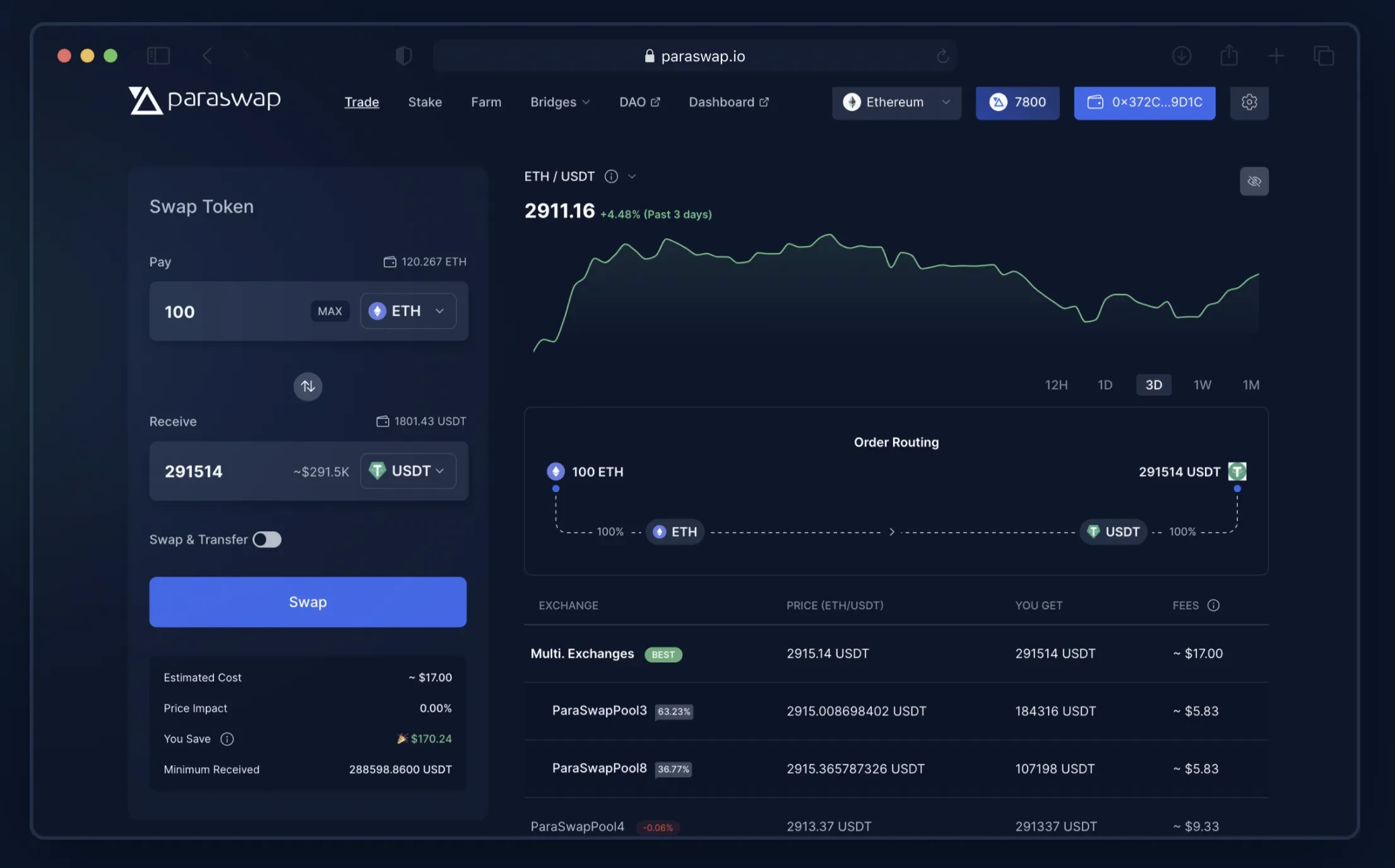 ParaSwap 是一个热门的多链 DeFi 聚合器,旨在为交易者和 DApp 提供最优价格、深度流动性和快速交易的渠道。为了方便用户,ParaSwap 将 DEX 流动性和借贷协议集成到一个安全的接口和 API 中。该平台结合了收益优化工具、独立的智能合约审计、先进的图表和 API 功能,帮助用户轻松找到最优价格。