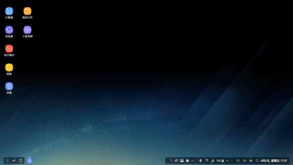 三星DeX提供的桌面环境如上图所示,系统把三星S8/S8+的部分自带应用放到了主界面上,而在桌面左下角可以查看所有的程度。此外,桌面右下角设置了任务栏,可以查看通知信息、时间和日期以及设置快捷菜单。