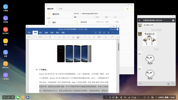 显然,三星DeX的想法与Windows 10 Continuum拓展坞的相似,但我们惊喜地发现三星DeX的体验相似更加有趣。主要是因为三星DeX的软件兼容性局限比较小,除了专门针对三星DeX优化适配的几款办公应用,三星DeX还能完美运行三星S8/S8+上的大部分安卓应用,譬如微信和微博,这让三星DeX的使用环境更丰富。