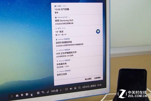 桌面的右下方是系统的通知栏,你可以在上面看到如时间、日期、WiFi、音量等众多信息,这也和Windows非常相近。当手机在DeX状态下有来电、短信、以及任何通知类的信息时,右下角也会推送相关信息,用户可直接接听来电通过扬声器对话,也可以直接拿起手机接听。