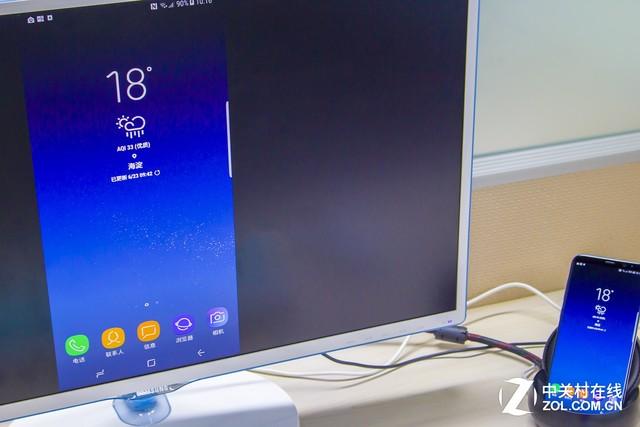 将三星S8/S8+手机拔出DeX,等待手机系统的时间也非常迅速,几乎无需任何等待就可以在移动端与桌面端进行快速的切换。比如用户在DeX界面上的京东或淘宝中购买了一款商品,在支付阶段就可以拿起手机进行指纹支付,或是手机地图上找查询的坐标,不关闭App直接将S8/S8+手机插入DeX,也可以在左下角直接打开App无接缝操作。