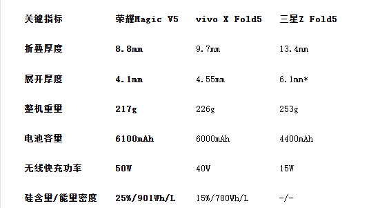 已经诞生——它就是荣耀Magic V5。这款手机不仅打破了折叠屏的设计局限,还在轻薄、续航和AI创新等多维度实现了全方位超越。无论是在超薄机身的设计上,还是在智能化操作体验中,荣耀Magic V5都展现了惊人的技术突破和卓越的使用感受,实现了用户体验的完美进化。通过数据对比,我们可以明显看出这款全球最薄折叠屏的技术优势。