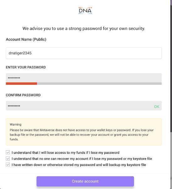 此页面为「登录/创建账号页面」。可通过右上角的登录/创建账户按钮打开。如果您没有DNA DEX的账号,可以点击「创建账户」进入创建界面。若已有账户,您可以点击「登录」按钮直接登录。