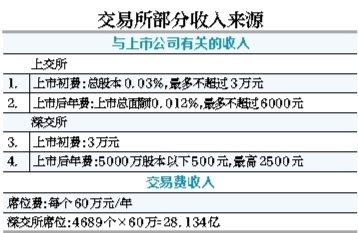 交易所还有两块主要收入来源,其一是跟上市公司相关的上市初费和上市月费;其二是跟会员相关的费用。如上交所A股上市初费为总股本的0.03%,最多不超过3万元,上市后按年收费,年费则为上市总面额的0.012%,不超过6000元。深交所的A股上市初费直接定为3万元,而上市后按月收月费,“5000万股本以下的500元,每增加1000万元股本增收100元,最高限额2500元”。