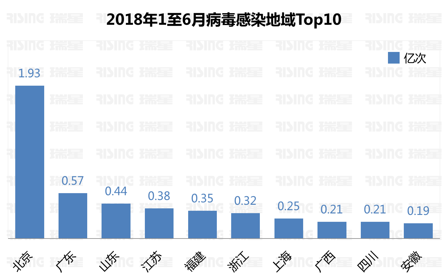 2018年上半年瑞星“云安全”系统共拦截挂马网站攻击38万余次,北京市受挂马攻击12万次,位列第一位,其次是浙江省受挂马攻击10万次。