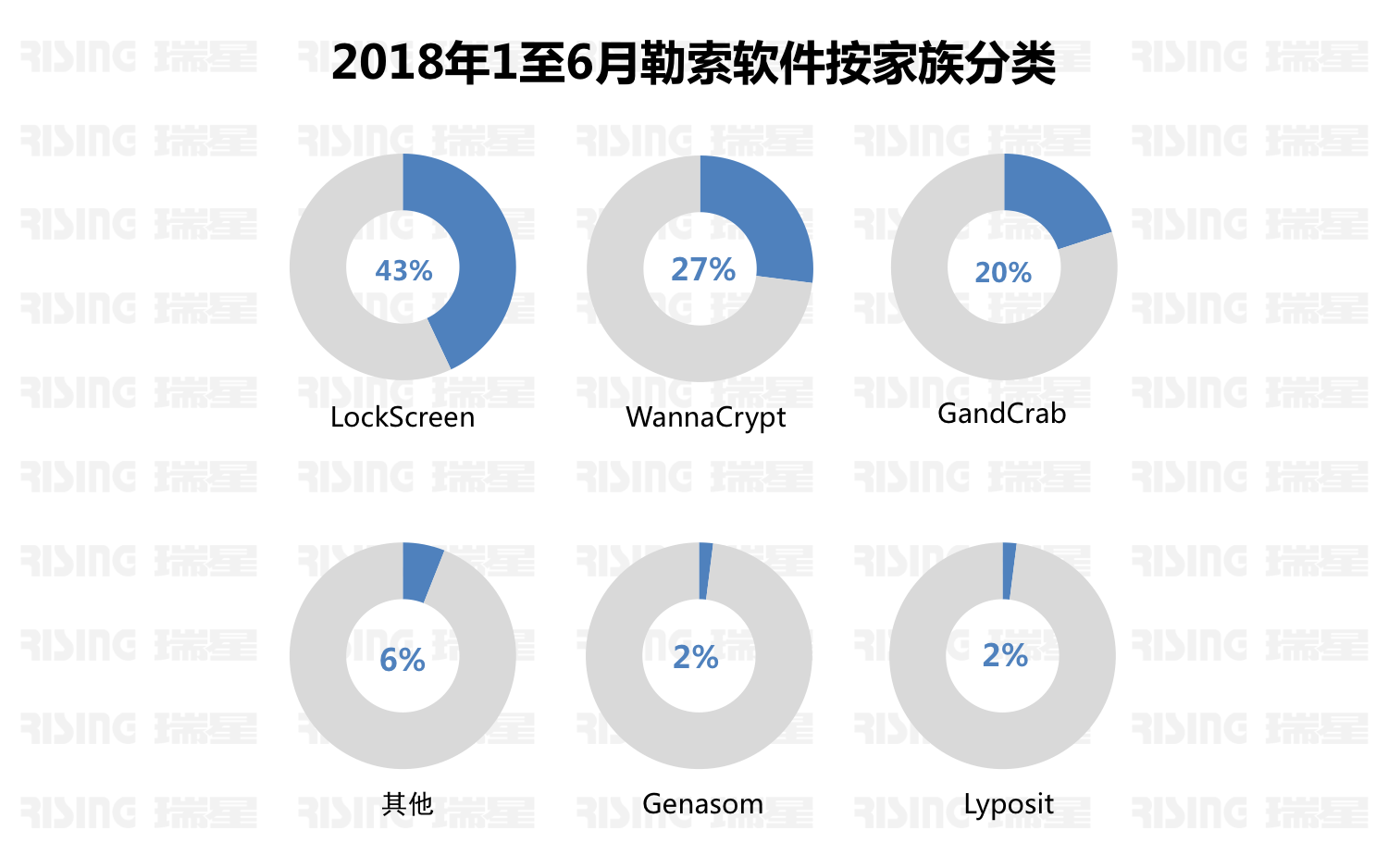 通过对瑞星捕获的勒索样本按家族分析发现,LockScreen家族占比43%,位列第一,其次为WannaCrypt占比27%,以及GandCrab占比20%。