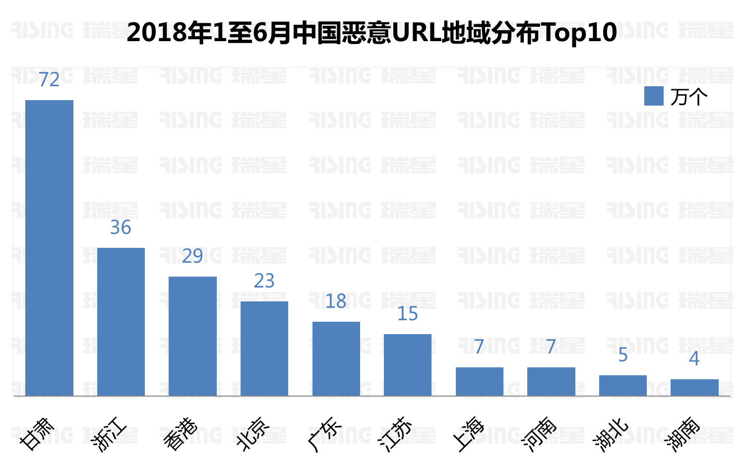 报告期内,甘肃省恶意网址(URL)总量为72万个,位列全国第一,其次是浙江省36万个,以及香港29万个,分别为二、三位。