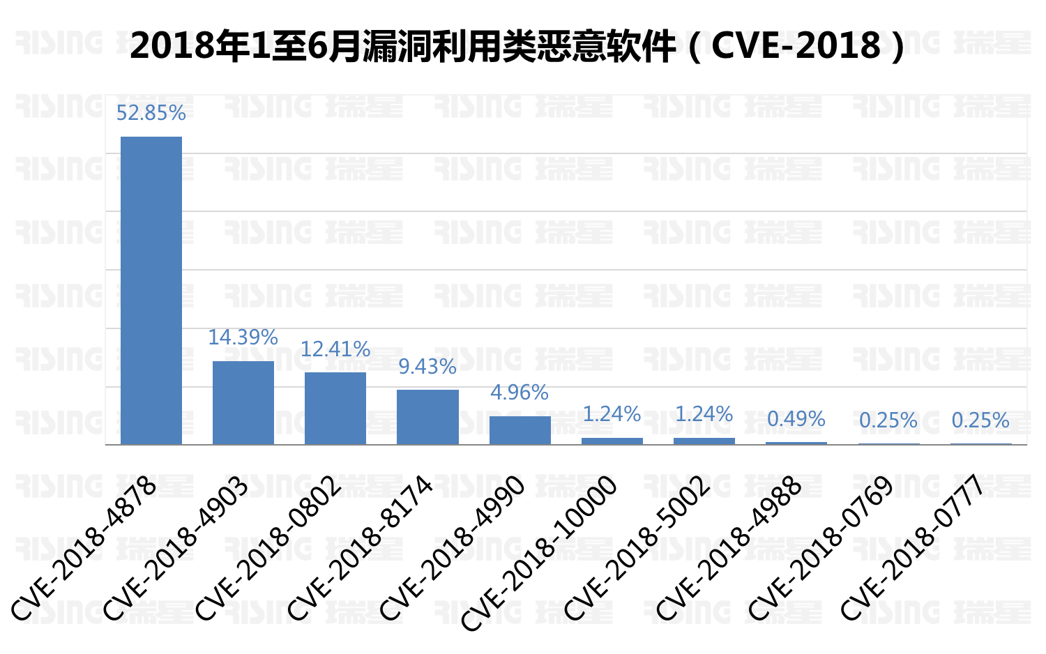 报告期内,CVE-2018-4878漏洞利用占比52.85%,位列第一位。该漏洞影响 Flash Player 所有版本,攻击者可以诱导用户打开包含恶意 Flash 代码文件的 Microsoft Office 文档、网页、垃圾电子邮件等。