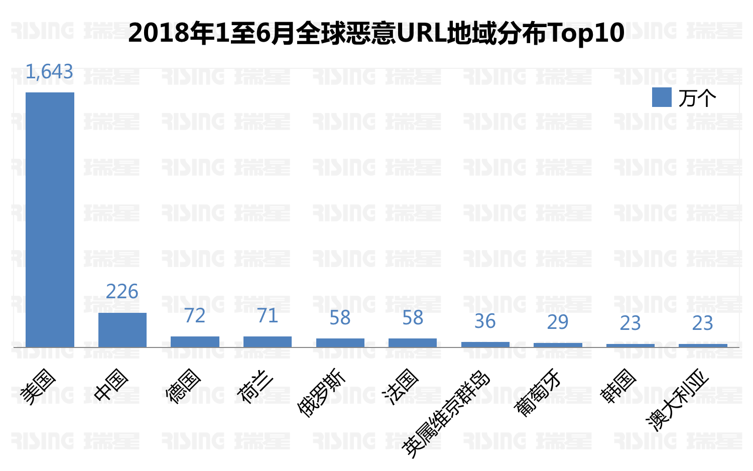 2018年上半年瑞星“云安全”系统在全球范围内共截获恶意网址(URL)总量4,785万个,其中挂马网站2,900万个,诈骗网站1,885万个。美国恶意URL总量为1,643万个,位列全球第一,其次是中国226万个,德国72万个,分别为二、三位。