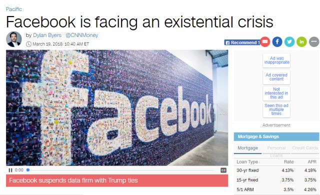 2018年3月,Facebook八千七百多万用户数据泄露,这些数据被“剑桥分析”公司非法利用以发送政治广告。此次事件被视为 Facebook 有史以来遭遇的最大型数据泄露事件。剑桥分析公司与Facebook进行了合作。前者开发了一个让用户进行“个性人格测试”的 Facebook App(类似国内微信的小程序),每个用户做完这个测试,就可以得到5美元。剑桥分析公司不仅收集了用户的测试结果,顺便收集了用户在Facebook上的个人信息。剑桥分析公司以此访问并获得了8700万活跃用户数据,然后建立起用户画像,依靠算法,根据每个用户的日常喜好、性格特点、行为特征,预测他们的政治倾向,然后定向向用户推送新闻,借助Facebook的广告投放系统,影响用户的投票行为。