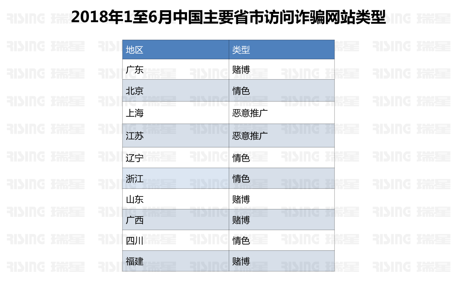 2018年上半年瑞星“云安全”系统共拦截诈骗网站攻击182万余次,广东受诈骗网站攻击32万次,位列第一位,其次是北京市受诈骗网站攻击30万次,第三名是上海市受诈骗网站攻击13万次。
