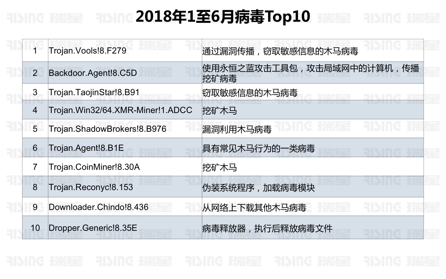 根据病毒感染人数、变种数量和代表性进行综合评估,瑞星评选出了2018年上半年1至6月病毒Top10: