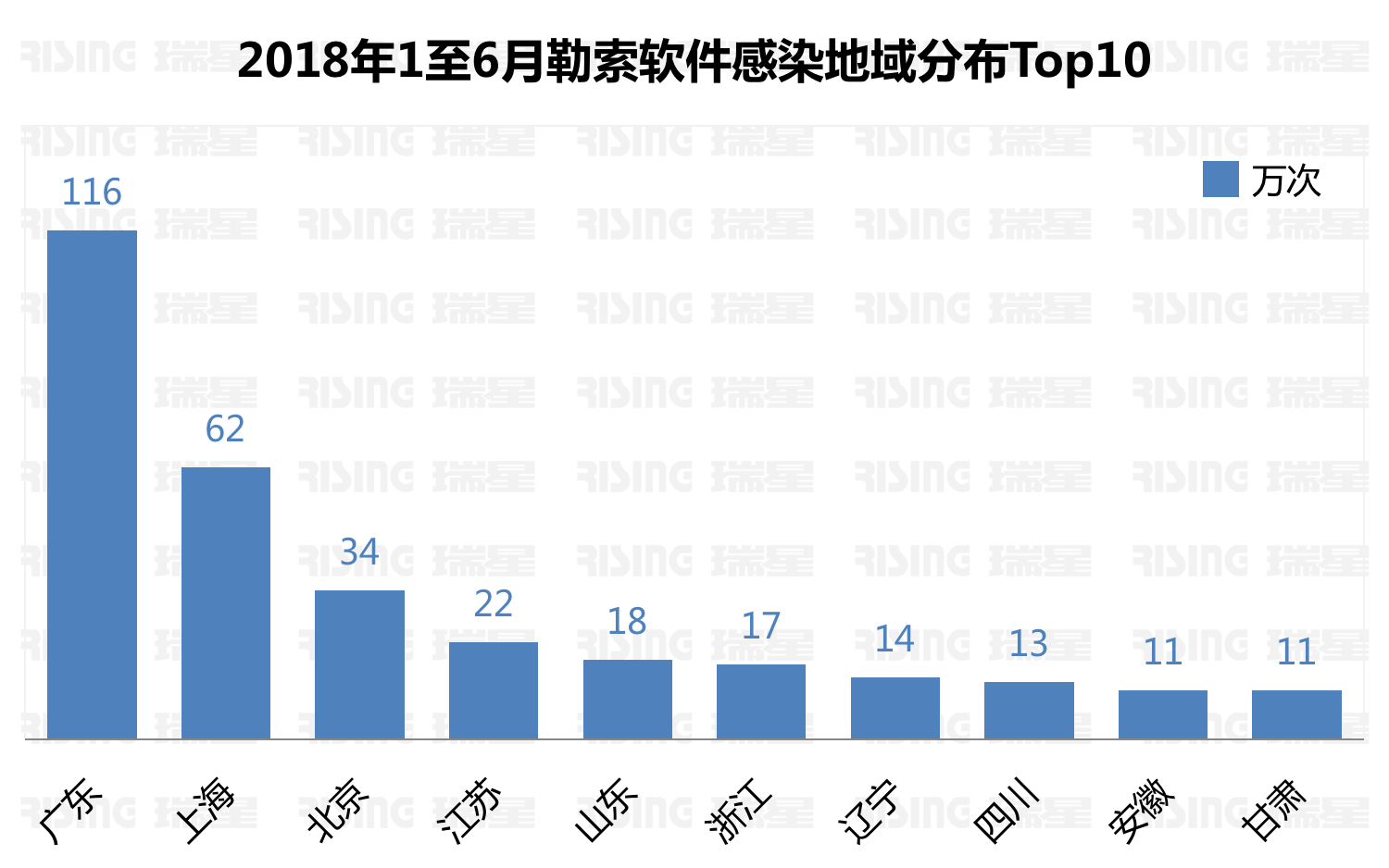 报告期内,瑞星“云安全”系统共截获勒索软件样本31.44万个,感染共计456万次,其中广东省感染116万次,位列全国第一,其次为上海市62万次,北京市34万次及江苏省22万次。