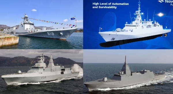 左上、右上、左下和右下分别为韩国海军大邱号护卫舰、纳凡蒂亚ALFA-3000方案示意图、南非海军伊散德尔瓦纳(MEKO A-200)和日本海上自卫队最上型护卫舰熊野号