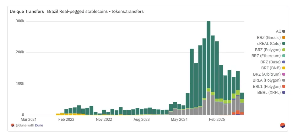 与发行和转账交易集中在以太坊主网的美元稳定币不同,雷亚尔稳定币的交易活动主要集中在Layer2网络和其他公链上。Polygon凭借原生交易量和活跃用户量成为主导通道:在2025年7月,录得约7.4万笔交易(涉及1.4万名独立用户),月交易量更是创下5亿雷亚尔(约合5000万美元)的历史记录。