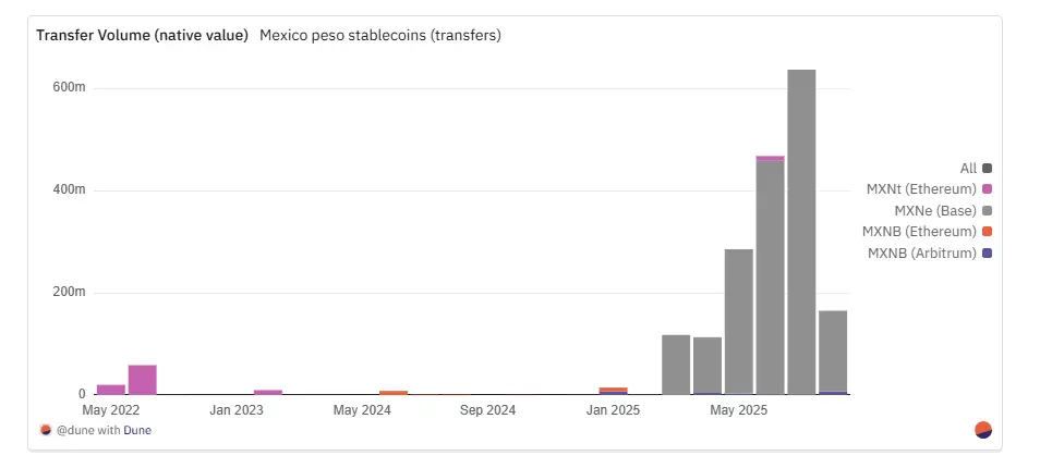 MXNe由Brale发行,却反其道而行之,通过在Base链上独家运营,已发展成为交易量最大的墨西哥比索锚定稳定币。