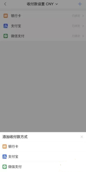 2、点击右上角 “ + ” ,选择收付款方式,输入正确信息并确认,对应的收付款方式即可添加成功。