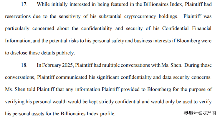 他在诉状中声称,公布他的财产“将造成重大伤害”,并使他面临“盗窃、黑客攻击、绑架以及对他和他的家人造成人身伤害的重大风险”。