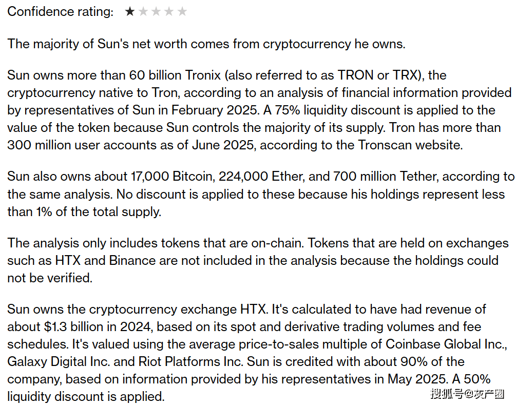 对于上述估算,彭博社仅给予一星置信度,反映出这家大牌媒体对孙宇晨相关财务数据的不确定性。