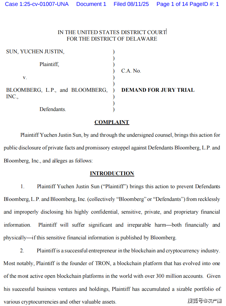 8月11日,孙宇晨在美国特拉华州联邦法院起诉彭博社,要求法官阻止其发布这些信息,声称此举是为了防止该媒体“鲁莽且不当披露其高度机密、敏感、私人和专有的财务信息”。