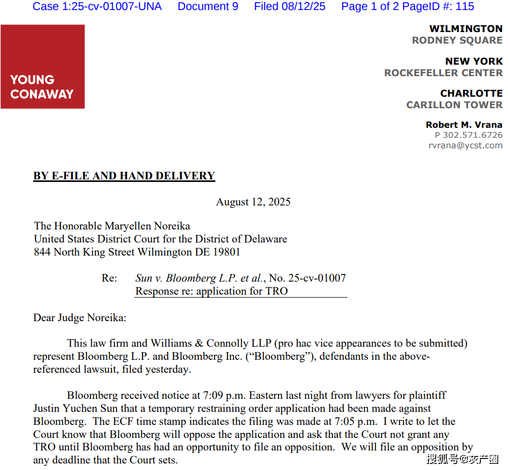8月12日,彭博社律师在致法院的一封信中表示,该公司将反对孙宇晨的限制令申请,并声称该申请的“整个依据”都毫无意义,因为它在申请提交之前就已经发布了这些信息。