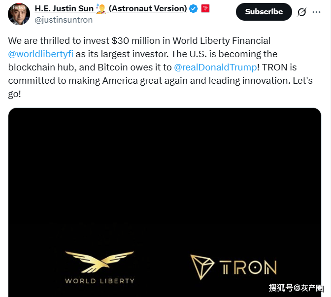 2024年11月,孙宇晨开始向特朗普家族的旗舰加密货币企业World Liberty Financial (WLF)投资至少7500万美元。当月,他在X上发帖称:“我们很高兴向World Liberty Financial投资3000万美元,成为该公司最大的投资者。美国正在成为区块链中心,比特币应该感谢@realDonaldTrump!”