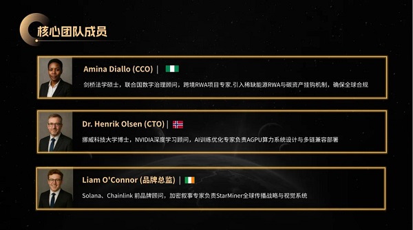 CCO Amina Diallo 出身于剑桥大学法学院,曾担任联合国数字治理项目顾问,专注于 RWA 与 ESG 资产的全球合规架构,是 StarMiner 多国合规流程的总设计师。