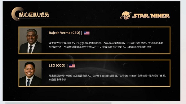 项目由 CEO Rajesh Verma 领导,他是美国波士顿大学计算机硕士,Polygon 公链早期团队成员,并担任 Armonia 公链的长期技术顾问。他同时也是全球稀缺能源基金会的共同创始人,被誉为李成株会长的继任者,主导整个 StarMiner 的架构蓝图。