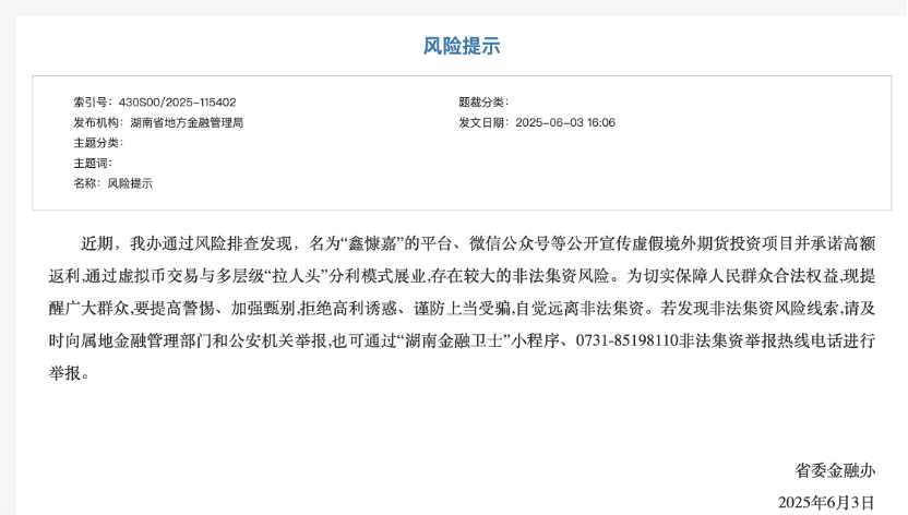 6月3日,湖南省地方金融管理局再次预警,揭露其通过虚拟币交易与多层级“拉人头”分利模式展业,存在较大的非法集资风险。