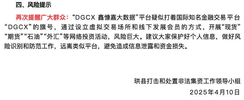 2025年1月,宜宾市叙州区财政局就发布了风险提示称,该区存在以线上线下方式宣传“DGCX”交易所投资的行为,涉嫌开展违法金融活动。4月,宜宾市珙县打击和处置非法集资工作领导小组再次发布风险提示,明确指出DGCX鑫慷嘉盗用DGCX名义,疑似开展传销活动。