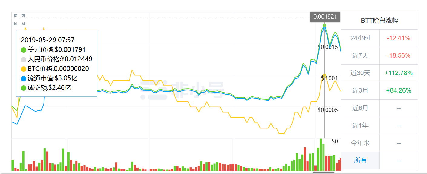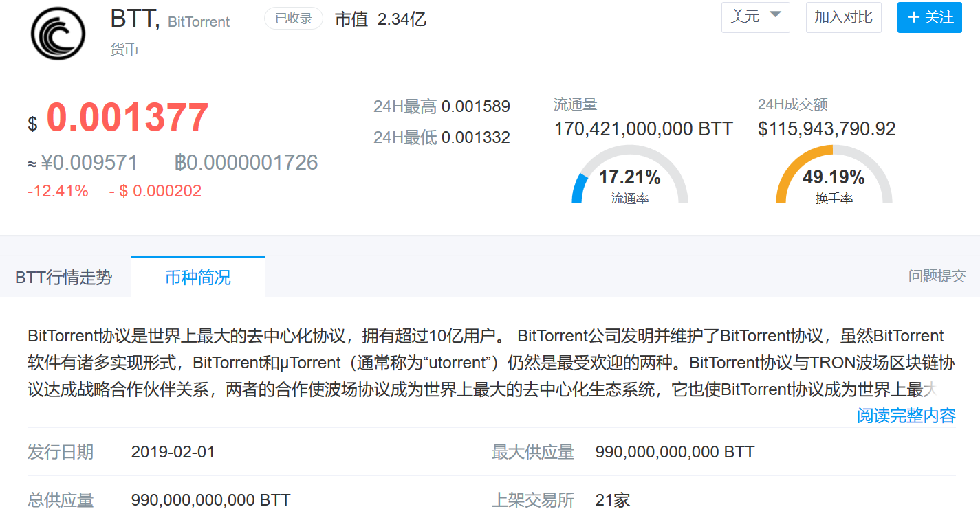 值得注意的是,去年6月,孙宇晨收购BitTorrent花费1.4亿美元,但是在收购完成不到一年,BitTorrent就以币安Launchpad首发项目上线交易所,据非小号行情数据显示,BTT上线亿美元,已高于其收购时所花的1.4亿美元,且其目前流通量仅为发行总量的17.21%。