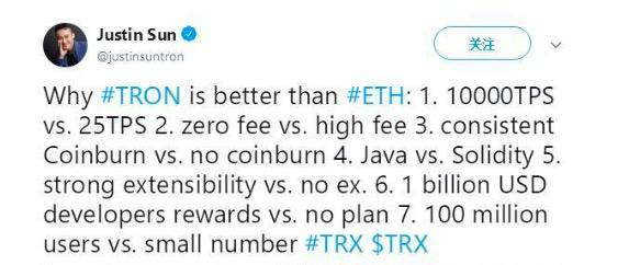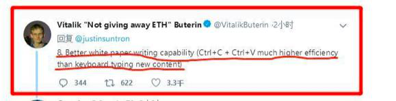 2018年4月6日,孙宇晨在推特发文列举了波场TRX比以太坊ETH好的7大理由,随即以太坊创始人V神回怼:“应该加上第8条理由,TRX复制粘贴白皮书效率远高于原创。”