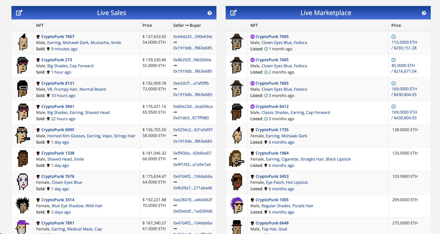 在这个网站上,它列举出了一些销售额较高的区块链收藏品,比如说 Cryptopunks。加密朋克的排名始终居高不下。