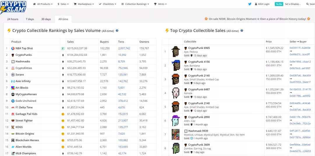 2.投资具体的NFT商品:比如CryptoPunks、NBA Top Shot卡牌、加密艺术作品、HashMasks、虚拟世界的土地、域名等。与加密货币相比,NFT商品的流动性较低,这意味着今天买了一副加密艺术作品,假如想以理想的高价卖出,可能要等上几个月,用时间来沉淀价值。从商业的角度,NFT商品和其它商品没有区别,“便宜没好货,好货不便宜”,动辄几个ETH的标价往往能劝退一批玩家,而且投资回报也是不确定的。