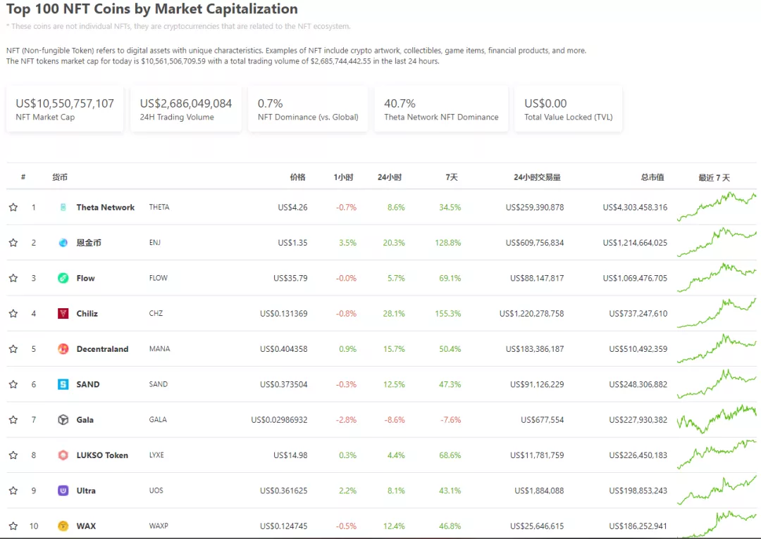 1.投资NFT概念的加密货币:比如ENJ、FLOW、CHZ、MANA、SAND、WAXP、WHALE、DEGO、AXS、MEME等。在CoinGecko的NFT概念板块中,有100种相关的加密货币,截至发稿,这些加密货币的总市值达105.51亿美元。所以买哪个呢?这取决于自己对项目的理解和信心。需要强调的是,NFT火热,最终的受益者还是ETH,因为目前90%以上的NFT应用都是基于以太坊网络。