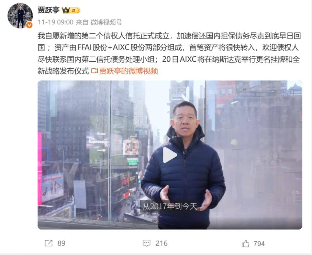 他在视频中先提到了FF上市后非常后悔退出了CEO职位,结果公司被华尔街破产黑帮设局控制,导致公司10亿美金被烧光。还好后来拨乱反正,他在今年5月重新出任了联合CEO,让公司良性运转,并开启了EAI+Crypto的新战略,也新增了第二个不可撤销的债权人信托,希望通过FFAI股份和新上市的AIXC股份增值来早日还债。