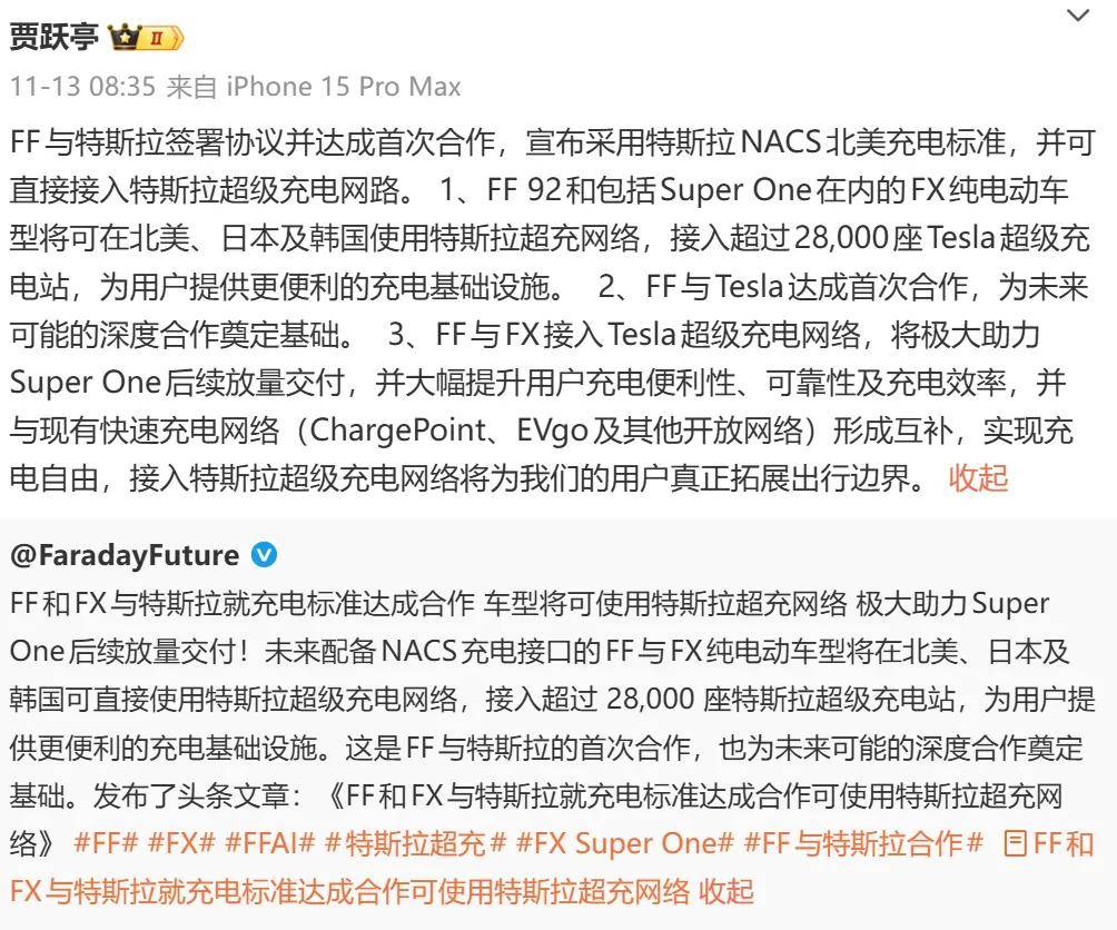 其次,法拉第未来还与特斯拉就充电网络开始了合作,听起来很厉害的感觉,我仔细查了一下,官方新闻稿说明:未来FF92与FX Super One等车型将配备NACS充电接口,从而能使用特斯拉在美、日、韩等地的超级充电网络,也就是接入超过28,000座超充站。不过,公告中并未披露对特斯拉的明确一次性付款或总投入金额。