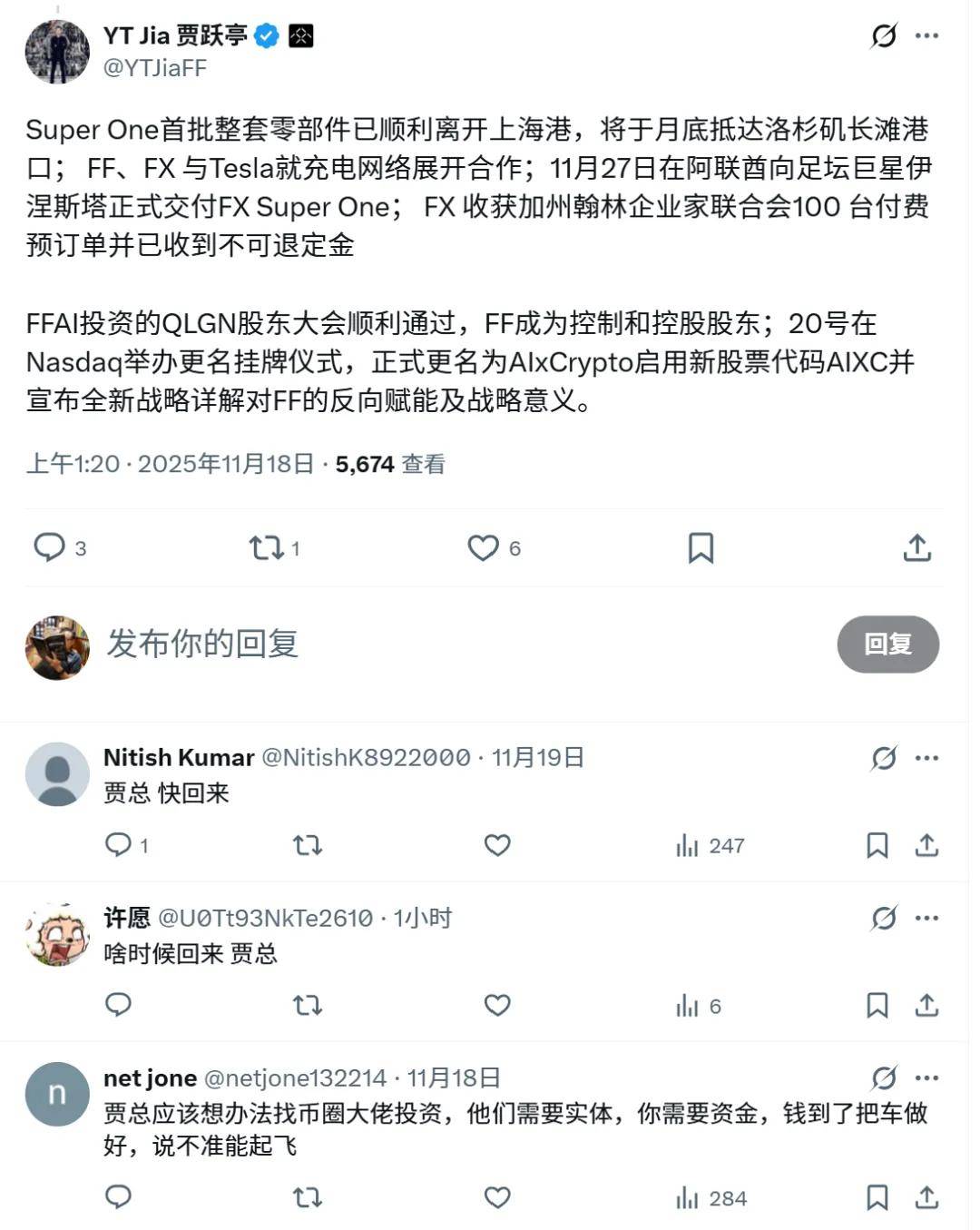 把加密/代币业务分拆成独立上市实体(AIXC),既能吸引加密/区块链兴趣的投资者,又能以代币、NFT、代币化权益等方式做用户激励与融资,形成“汽车 + 金融/代币”复合模式。报道也显示 AIXC 会购买 FFAI 股份,形成资本层面互助。