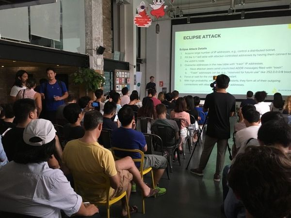 图注:凤凰财经参与了周日的一场分享会,主要语言为英语。现场的三位分享者分别一家比特币交易密钥公司的创始人以及两位来自美国加州大学伯克利名校的学生,目前正在总部位于旧金山的全球知名比特币公司实习,他们分享了比特币网络攻击的技术可能性。(现场拍摄图)